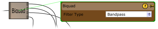 The Biquad Filter Module implements a subtractive synthesis six-coefficient digital IIR filter with input/output power balancing for some pole stability. It takes an input signal and several continuous real-time parameter values and produces a filtered output Signal. Available forms of the filter include: Lowpass, Highpass, Bandpass, Notch, and Allpass. For more information about IIR filter forms and configurations, see Robert Bristow-Johnson's excellent EQ Cookbook.