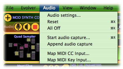 Causes an immediate global reset to initial state for the Audio Engine and all loaded patches. Keyboard shortcut: Ctrl-X |