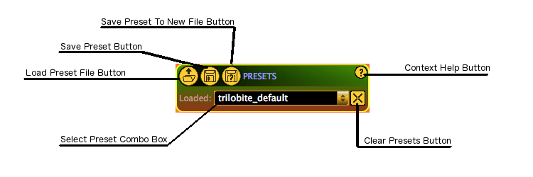 Clicking this button will save the current preset state back to the file from which it was loaded. If you are working in the “trilobite_default” preset, then this button will behave exactly as the Save Preset to New File Button.